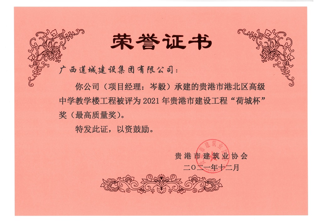 2021年貴港市建設(shè)工程“荷城杯”獎(jiǎng)(最高質(zhì)量獎(jiǎng))貴港市港北區(qū)高級(jí)中學(xué)教學(xué)樓工程,項(xiàng)目經(jīng)理:岑毅