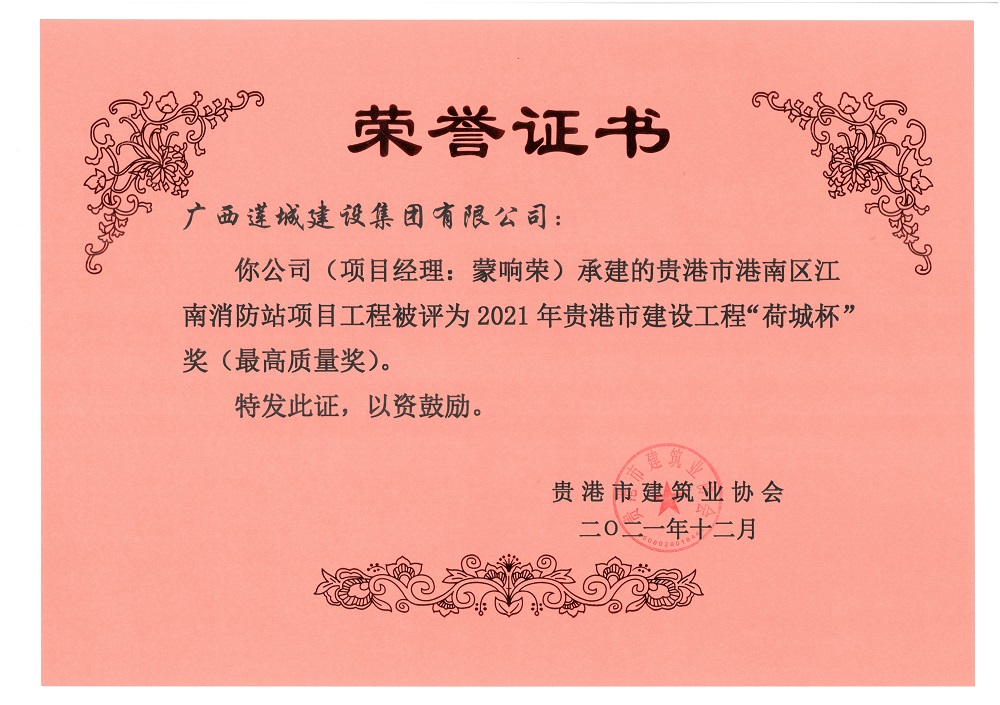 2021年貴港市建設(shè)工程“荷城杯”獎(jiǎng)(最高質(zhì)量獎(jiǎng))貴港市港南區(qū)江南消防站項(xiàng)目工程,項(xiàng)目經(jīng)理:蒙響榮