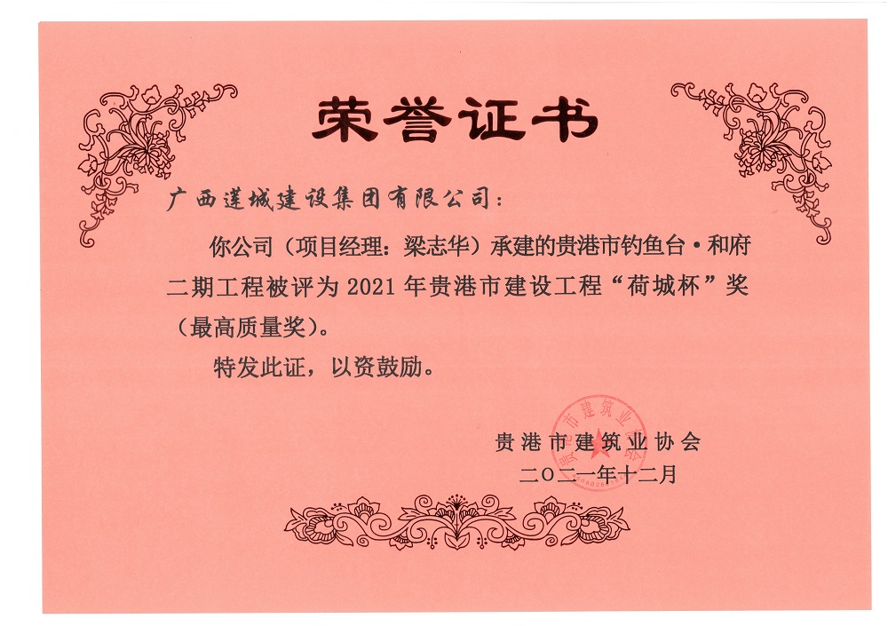 2021年貴港市建設(shè)工程“荷城杯”獎(jiǎng)(最高質(zhì)量獎(jiǎng))貴港市釣魚臺(tái)-和府二期工程,項(xiàng)目經(jīng)理:梁志華