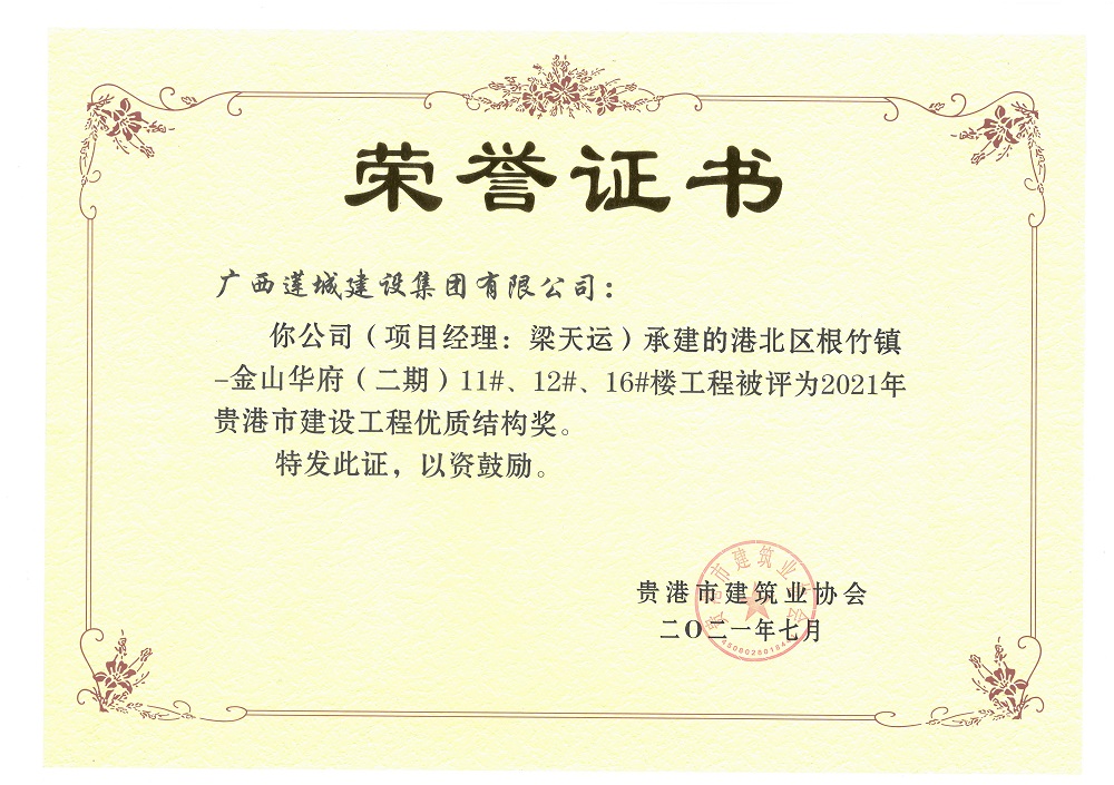2021年貴港市建設(shè)工程優(yōu)質(zhì)結(jié)構(gòu)獎(jiǎng)港北區(qū)根竹鎮(zhèn)-金山華府(二期)11#、12#、16#樓工程,項(xiàng)目經(jīng)理:梁天運(yùn)