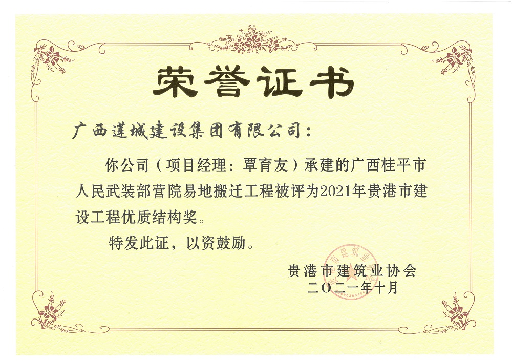 2021年貴港市建設(shè)工程優(yōu)質(zhì)結(jié)構(gòu)獎(jiǎng)廣西桂平市人民武裝部營(yíng)院易地搬遷工程,項(xiàng)目經(jīng)理:覃育友