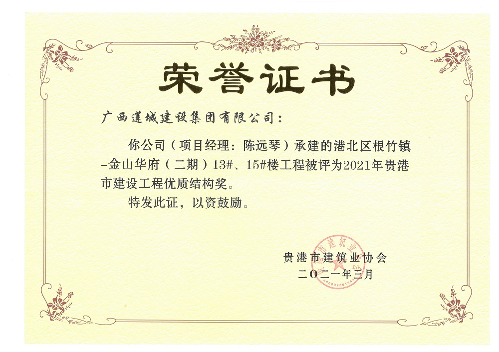 2021年貴港市建設(shè)工程優(yōu)質(zhì)結(jié)構(gòu)獎(jiǎng)港北區(qū)根竹鎮(zhèn)—金山華府(二期)13#、15#樓工程,項(xiàng)目經(jīng)理:陳遠(yuǎn)琴