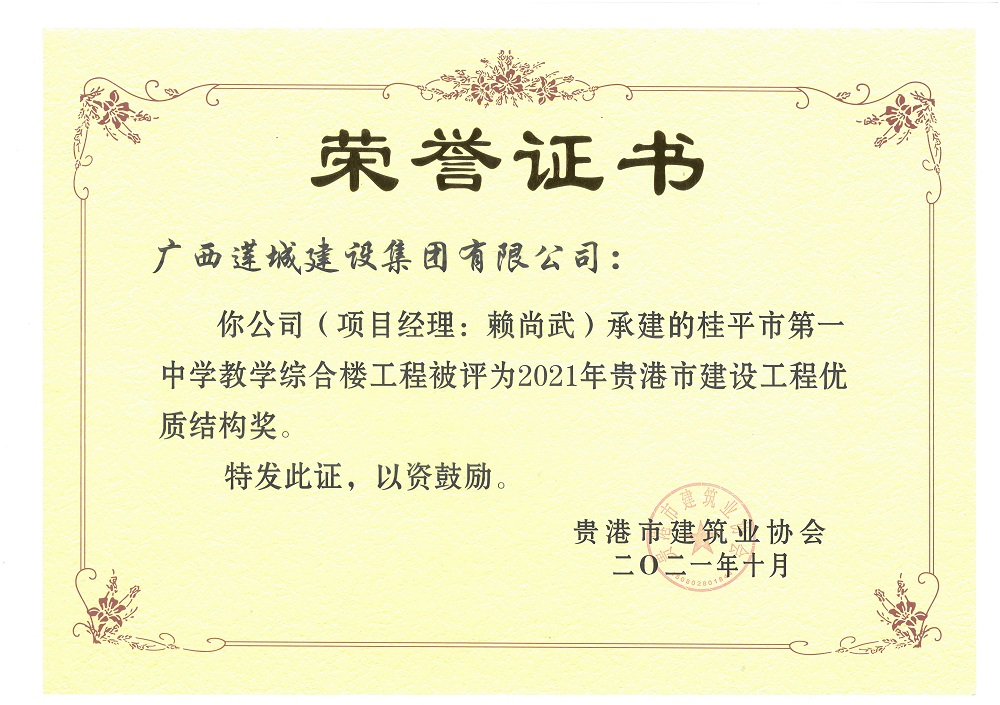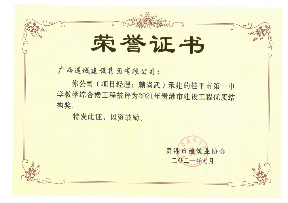 2021年貴港市建設(shè)工程優(yōu)質(zhì)結(jié)構(gòu)獎(jiǎng)桂平市第一中學(xué)教學(xué)綜合樓工程,項(xiàng)目經(jīng)理:賴尚武