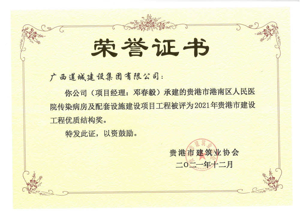 2021年貴港市建設(shè)工程優(yōu)質(zhì)結(jié)構(gòu)獎(jiǎng)貴港市港南區(qū)人民醫(yī)院傳染病及配套設(shè)施建設(shè)項(xiàng)目工程,項(xiàng)目經(jīng)理:鄧春毅