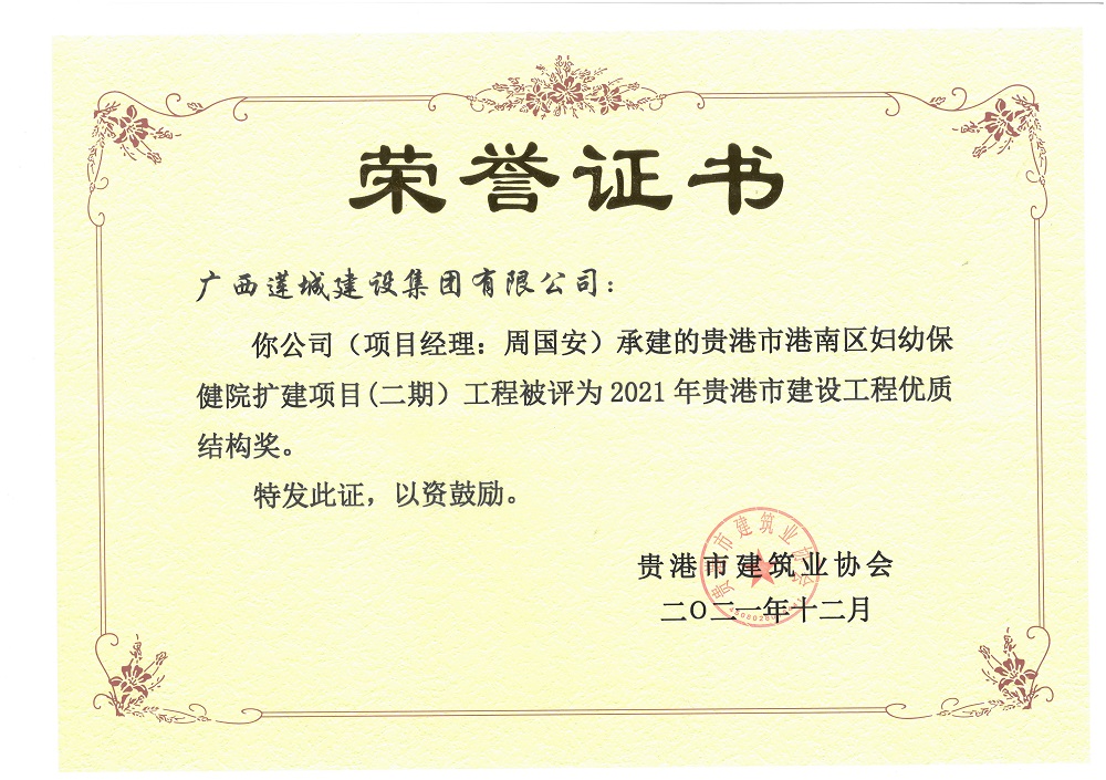 2021年貴港市建設(shè)工程優(yōu)質(zhì)結(jié)構(gòu)獎(jiǎng)貴港市港南區(qū)婦幼保健院擴(kuò)建項(xiàng)目(二期)工程,項(xiàng)目經(jīng)理:周國(guó)安
