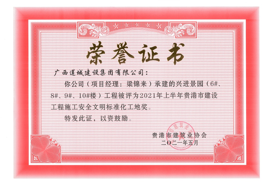 2021年上半年貴港市建設(shè)工程施工安全文明標(biāo)準(zhǔn)化工地獎(jiǎng)興進(jìn)景園(6#、8#、9#、10#樓)工程,項(xiàng)目經(jīng)理:梁錦來