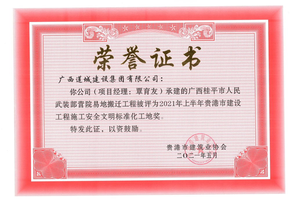 2021年上半年貴港市建設(shè)工程施工安全文明標(biāo)準(zhǔn)化工地獎(jiǎng)廣西桂平市人民武裝部營(yíng)院易地搬遷工程,項(xiàng)目經(jīng)理:覃育友