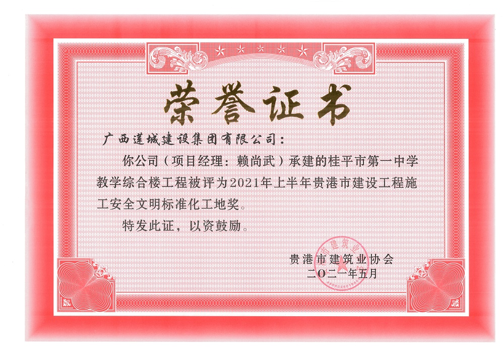 2021年上半年貴港市建設(shè)工程施工安全文明標(biāo)準(zhǔn)化工地獎(jiǎng)桂平市第一中學(xué)教學(xué)綜合樓工程,項(xiàng)目經(jīng)理:賴尚武