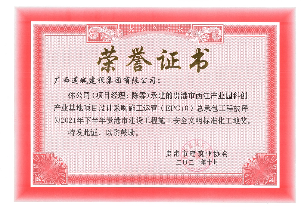 2021年下半年貴港市建設(shè)工程施工安全文明標(biāo)準(zhǔn)化工地獎(jiǎng)貴港市西江產(chǎn)業(yè)園科創(chuàng)產(chǎn)業(yè)基地項(xiàng)目設(shè)計(jì)采購(gòu)施工運(yùn)營(yíng)(EPC+0)總承包工程,項(xiàng)目經(jīng)理:陳霖