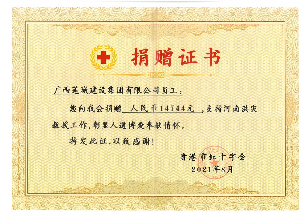 2021年向貴港市紅十字會(huì)河南洪災(zāi)捐款,員工捐款14744元