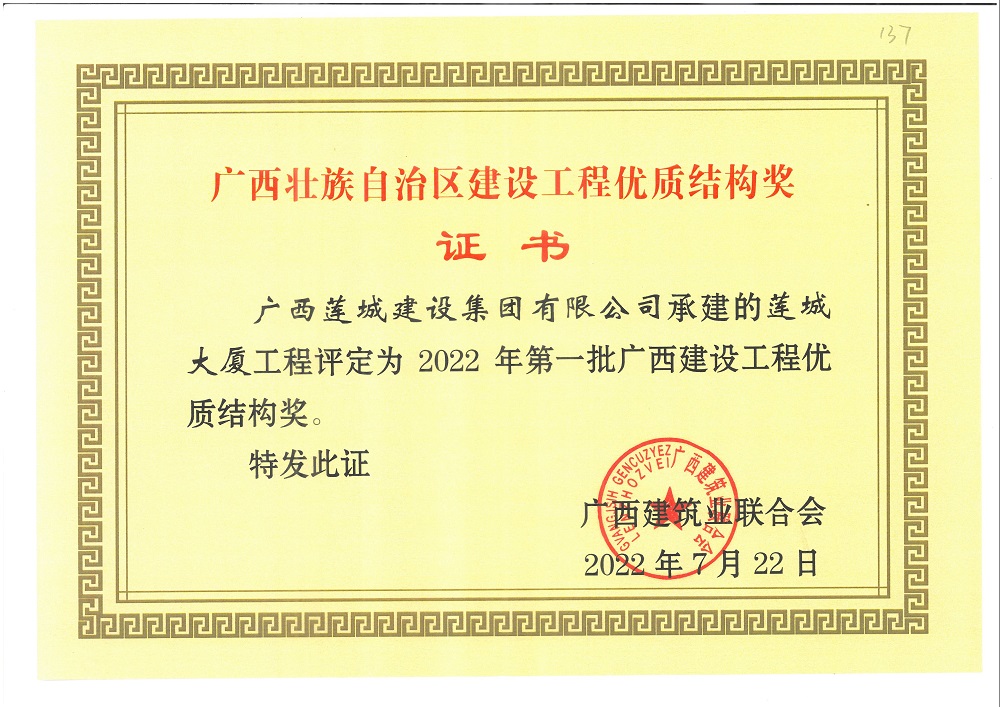 2022 年第一批廣西建設(shè)工程優(yōu)質(zhì)結(jié)構(gòu)獎(jiǎng)蓮城大廈,項(xiàng)目經(jīng)理:姜雄雁