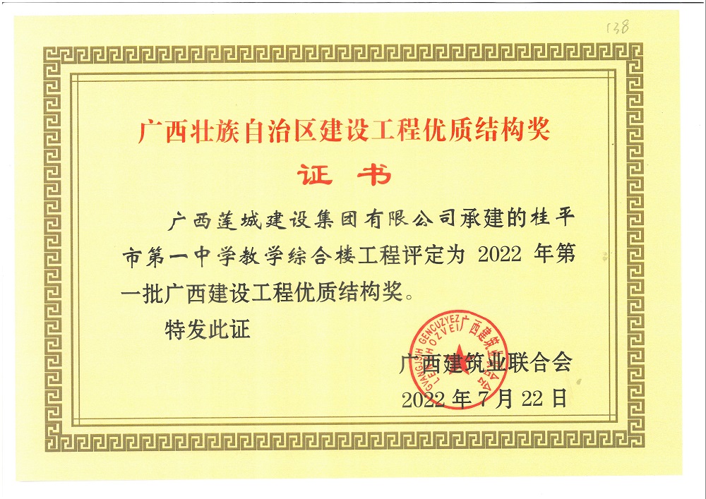 2022 年第一批廣西建設(shè)工程優(yōu)質(zhì)結(jié)構(gòu)獎(jiǎng)桂平市第一中學(xué)教學(xué)綜合樓工程,項(xiàng)目經(jīng)理:賴尚武