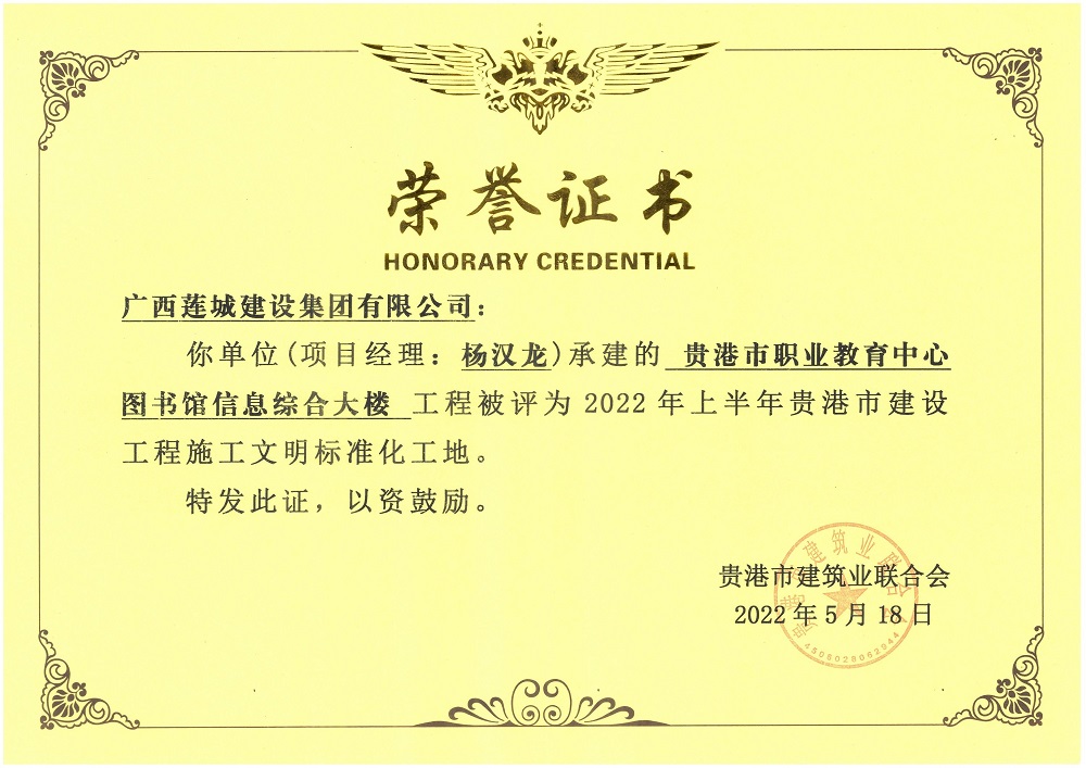 2022年上半年貴港市建設(shè)工程施工文明標(biāo)準(zhǔn)化工地貴港市職業(yè)教育中心圖書館信息綜合大樓工程,項(xiàng)目經(jīng)理:楊漢龍