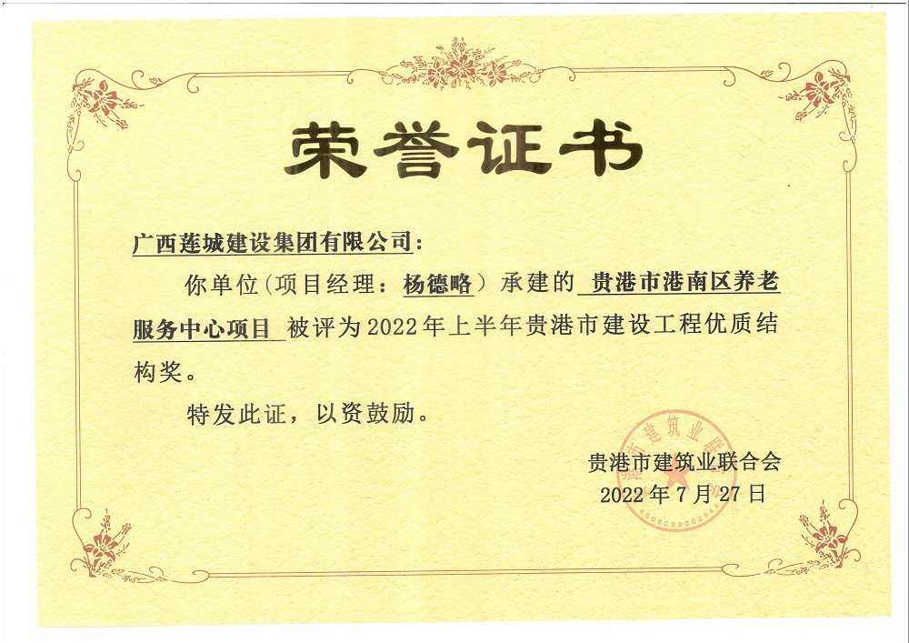2022年上半年貴港市建設(shè)工程優(yōu)質(zhì)結(jié)構(gòu)獎(jiǎng)貴港市港南區(qū)養(yǎng)老服務(wù)中心項(xiàng)目,項(xiàng)目經(jīng)理:楊德略
