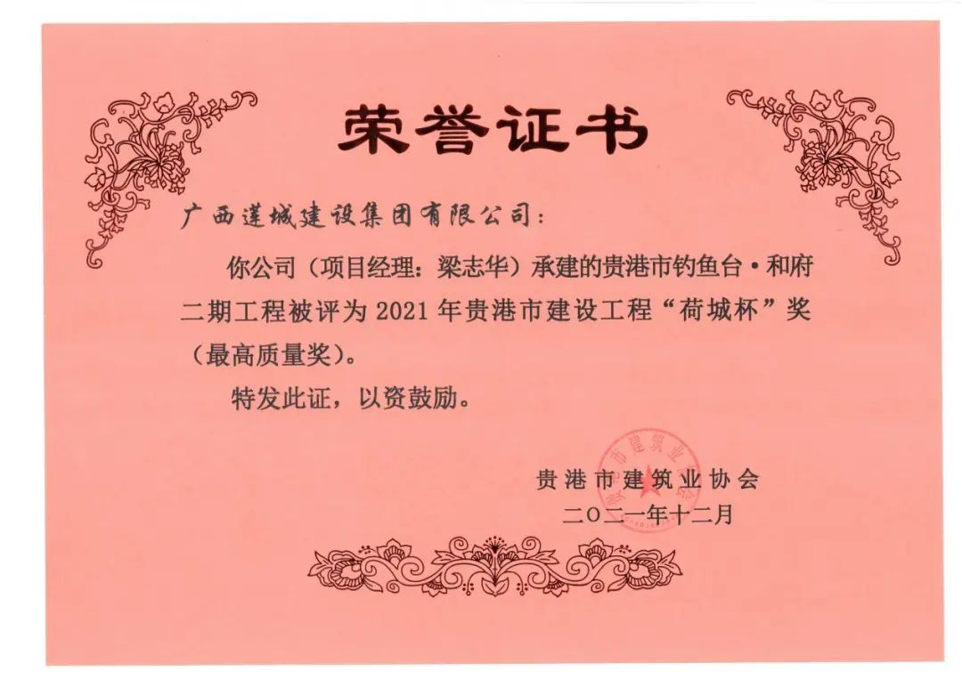 經貴港市建筑業(yè)協(xié)會評選公示,集團公司承建的貴港市釣魚臺·和府二期工程,貴港市港北區(qū)高級中學教學樓工程,貴港市港南區(qū)江南消防站項目工程,貴港市檢察院辦案和專業(yè)技術用房、地下訓練場工程,貴港市中心血站搬遷重建項目(一期)業(yè)務樓工程等5個項目被評為2021年貴港市建設工程“荷城杯”獎(最高質量獎)。
