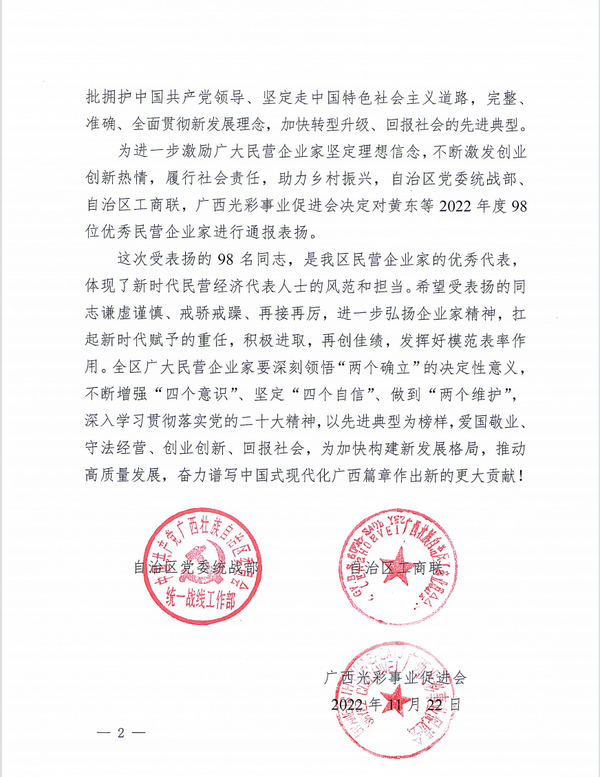 為進(jìn)一步激勵(lì)廣大民營企業(yè)家堅(jiān)定理想信念,不斷激發(fā)創(chuàng)業(yè)創(chuàng)新熱情,履行社會(huì)責(zé)任,助力鄉(xiāng)村振興,11月22日,自治區(qū)黨委統(tǒng)戰(zhàn)部、自治區(qū)工商聯(lián)、廣西光彩事業(yè)促進(jìn)會(huì)對2022年度98位優(yōu)秀民營企業(yè)家進(jìn)行通報(bào)表揚(yáng)。廣西蓮城建設(shè)集團(tuán)有限公司總經(jīng)理陳夢華獲評為2022年度廣西優(yōu)秀民營企業(yè)家。