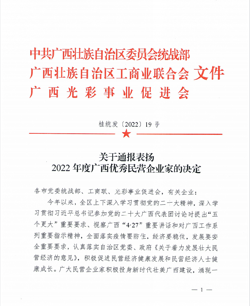 為進一步激勵廣大民營企業(yè)家堅定理想信念,不斷激發(fā)創(chuàng)業(yè)創(chuàng)新熱情,履行社會責任,助力鄉(xiāng)村振興,11月22日,自治區(qū)黨委統(tǒng)戰(zhàn)部、自治區(qū)工商聯(lián)、廣西光彩事業(yè)促進會對2022年度98位優(yōu)秀民營企業(yè)家進行通報表揚。廣西蓮城建設(shè)集團有限公司總經(jīng)理陳夢華獲評為2022年度廣西優(yōu)秀民營企業(yè)家。 創(chuàng)業(yè)不是一帆風順的,它需要長久地在一...