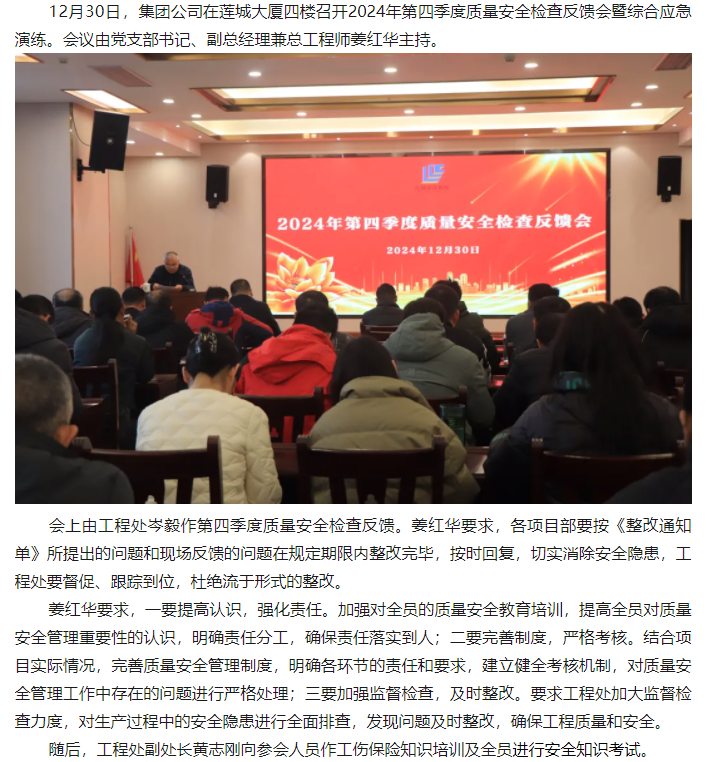 集團(tuán)公司召開2024年第四季度質(zhì)量安全檢查反饋會(huì)暨綜合應(yīng)急演練