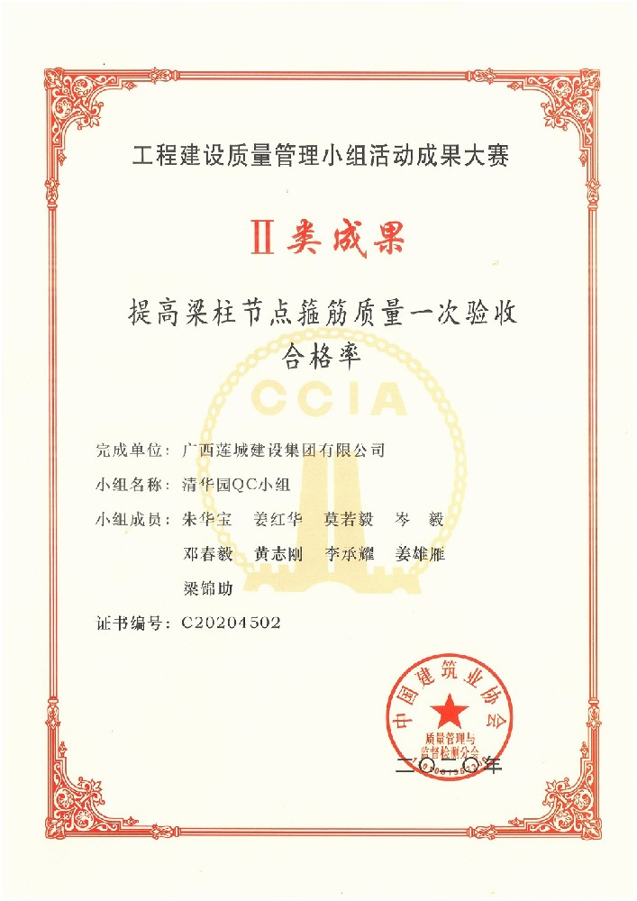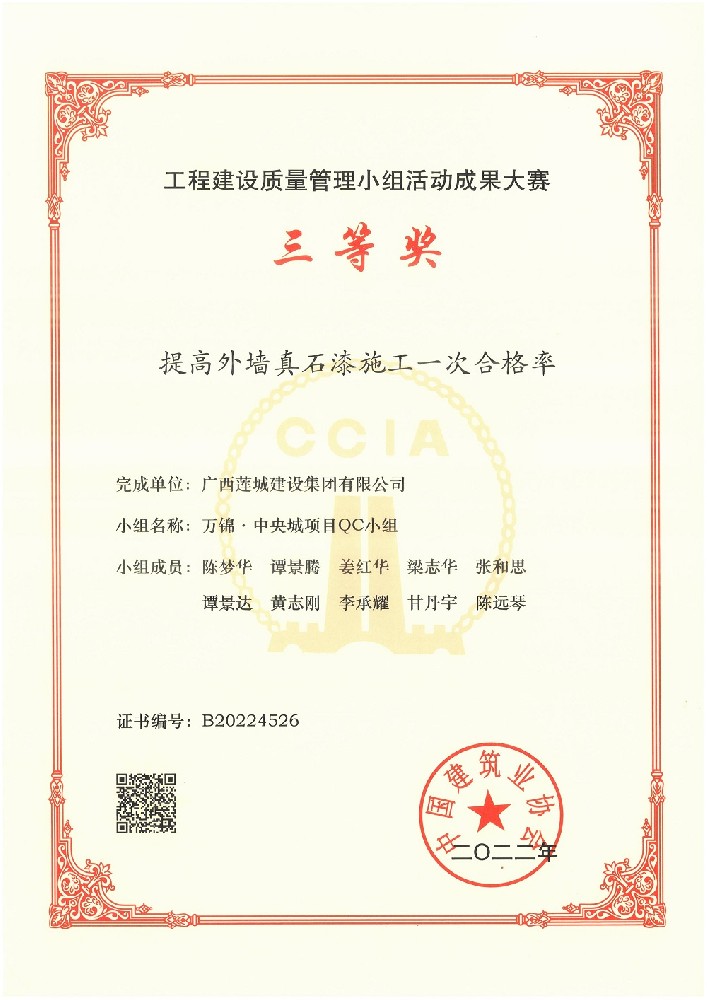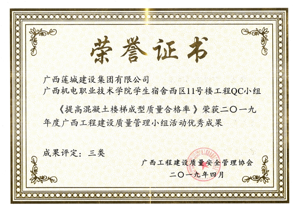 提高外墻真石漆施工一次合格率,三等獎(jiǎng),成員:陳夢華、譚景騰、姜紅華、梁志華、張和思、譚景達(dá)、黃志剛、李承耀、甘丹宇、陳遠(yuǎn)琴提高屋面防水卷材施工質(zhì)量一次合格率,二等獎(jiǎng),小組成員:陳夢華、譚燕喜、姜紅華、陳霖、姜雄雁、黃文亮、黃志剛、岑毅、黃娟、韋建協(xié)提高現(xiàn)澆樓梯混凝土結(jié)構(gòu)施工質(zhì)量,三等獎(jiǎng),成員:陳夢華、譚...