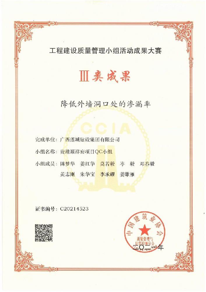 降低外墻洞口處的滲漏率,貴港順祥府項(xiàng)目QC小組,成員:陳夢華、姜紅華,莫若毅,岑毅,鄧春毅,黃志剛,朱華寶,李承耀,姜雄雁提高地下室曲面剪力墻施工質(zhì)量一次驗(yàn)收合格率,蓮城大廈項(xiàng)目QC小組,成員:陳夢華、朱華寶,姜紅華,莫若毅,岑毅,鄧春毅,黃志剛,李承耀,姜雄雁,黃文靜提高樓梯混凝土施工質(zhì)量,興進(jìn)景園項(xiàng)...
