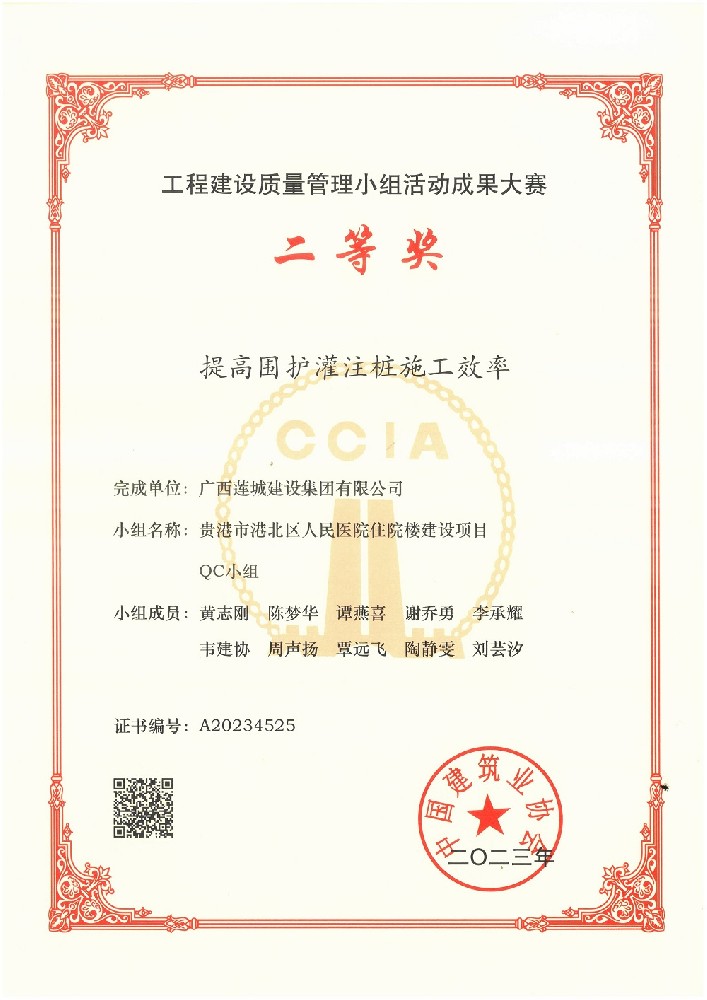 提高圍護(hù)灌注樁施工效率,QC二等獎(jiǎng),貴港市港北區(qū)人民醫(yī)院住院樓建設(shè)項(xiàng)目QC小組成員:黃志剛、陳夢華、譚燕喜、謝喬勇、李承耀、韋建協(xié)、周聲揚(yáng)、覃遠(yuǎn)飛、陶靜雯、劉蕓汐提高旋挖成孔灌注樁施工質(zhì)量合格率,QC三等獎(jiǎng),港南中學(xué)學(xué)生宿舍樓項(xiàng)目部QC小組成員:陳夢華、姜紅華、黃添明、梁志華、陳霖、梁軍、陳熙林、莫智莉、陳遠(yuǎn)琴...